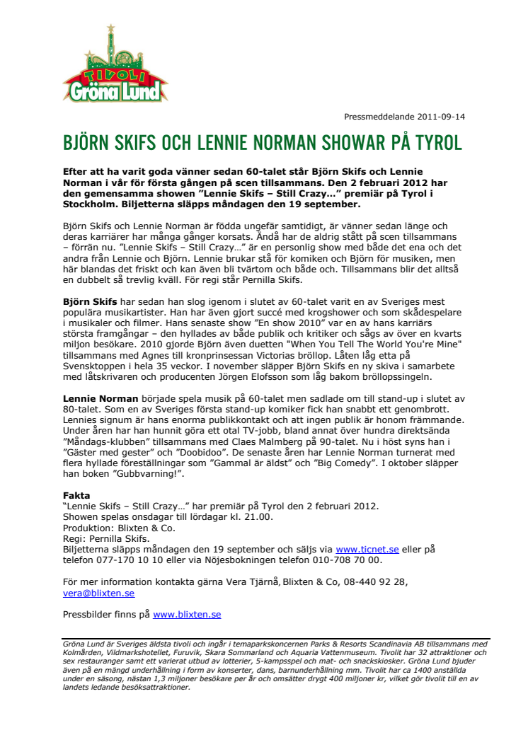 Efter att ha varit goda vänner sedan 60-talet står Björn Skifs och Lennie Norman i vår för första gången på scen tillsammans. Den 2 februari 2012 har den gemensamma showen ”Lennie Skifs – Still Crazy…” premiär på Tyrol i Stockholm. Biljetterna släpps måndagen den 19 september.