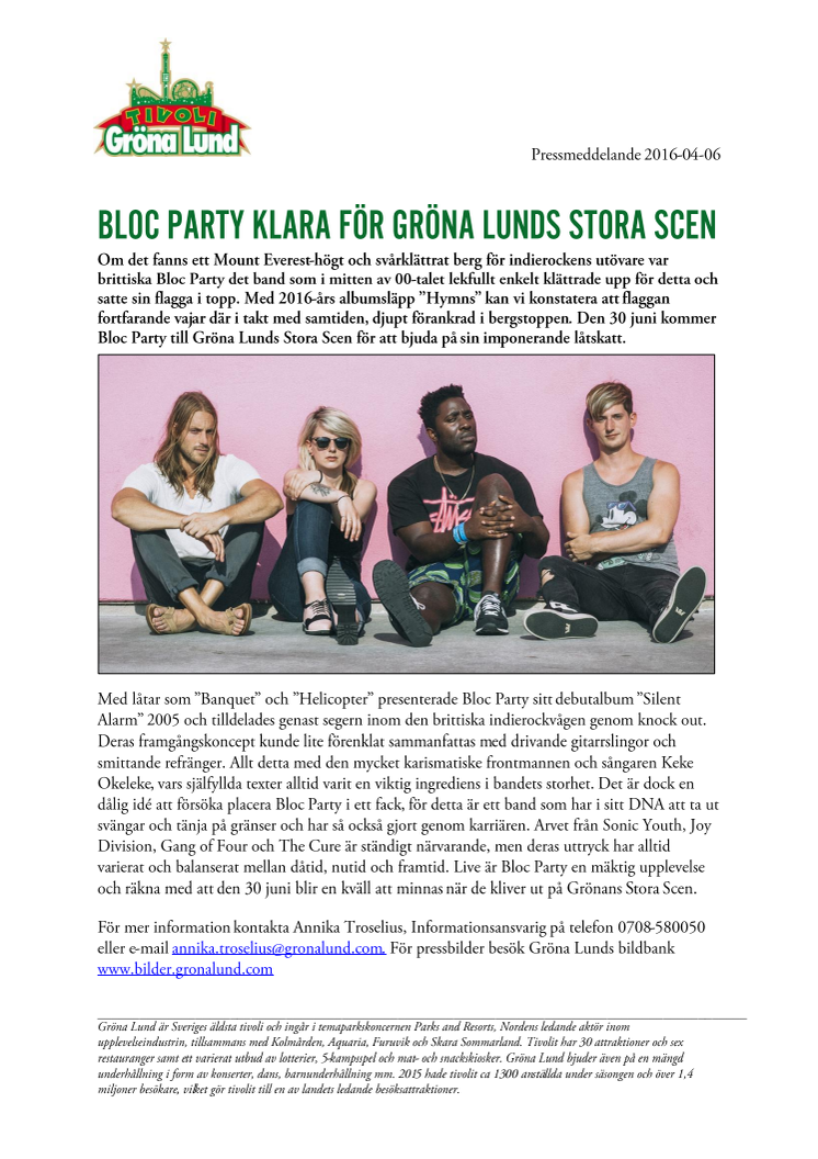 Om det fanns ett Mount Everest-högt och svårklättrat berg för indierockens utövare var brittiska Bloc Party det band som i mitten av 00-talet klättrade upp för detta och satte sin flagga i topp. Med 2016-års albumsläpp ”Hymns” kan vi konstatera att flaggan fortfarande vajar där. Den 30 juni kommer Bloc Party till Gröna Lunds Stora Scen för att bjuda på sin imponerande låtskatt.