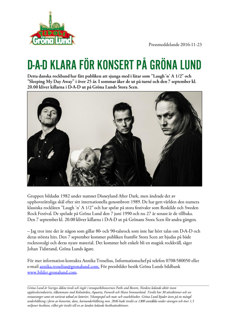 Detta danska rockband har fått publiken att sjunga med i låtar som ”Laugh ’n’ A 1/2” och ”Sleeping My Day Away” i över 25 år. I sommar åker de ut på turné och den 7 september kl. 20.00 kliver killarna i D-A-D ut på Gröna Lunds Stora Scen.