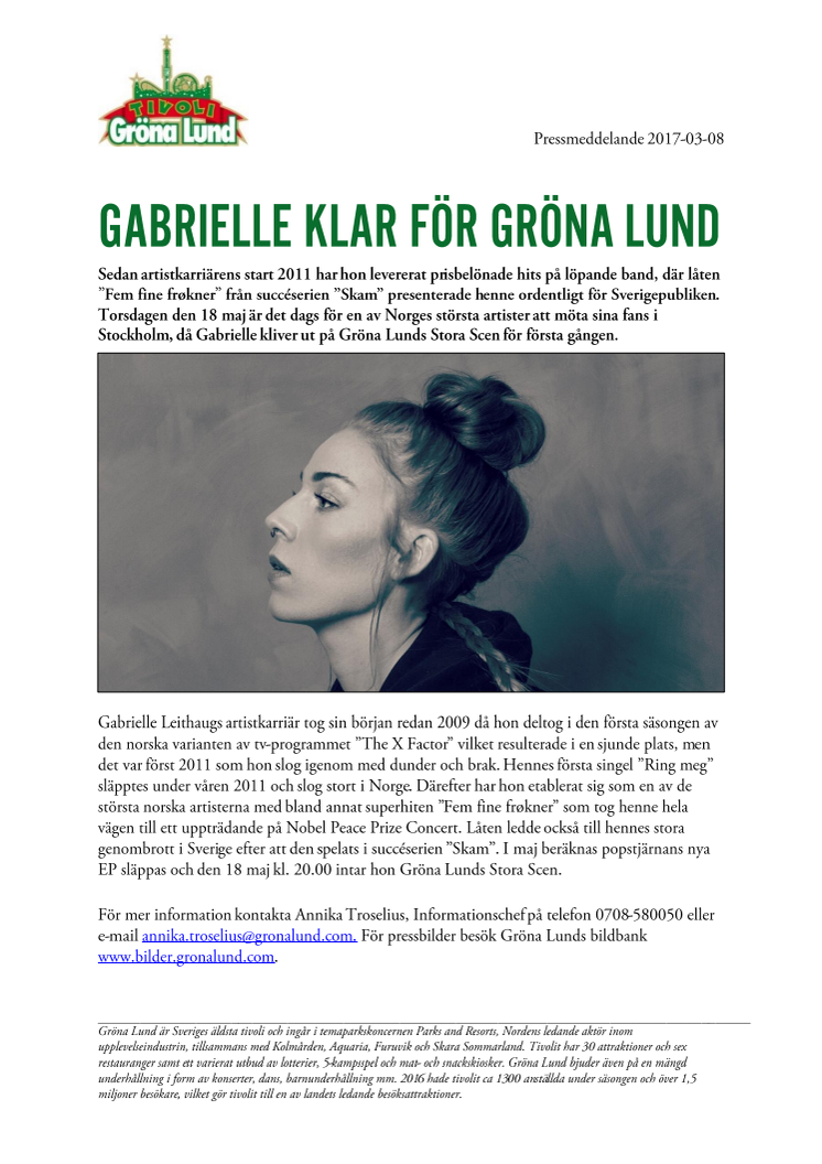 Sedan artistkarriärens start 2011 har hon levererat prisbelönade hits på löpande band, där låten ”Fem fine frøkner” från succéserien ”Skam” presenterade henne ordentligt för Sverigepubliken. Torsdagen den 18 maj är det dags för en av Norges största artister att möta sina fans i Stockholm, då Gabrielle kliver ut på Gröna Lunds Stora Scen för första gången.