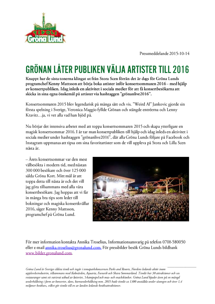 Knappt har de sista tonerna klingat ut från Stora Scen förrän det är dags för Gröna Lunds programchef Kenny Mattsson att börja boka artister inför konsertsommaren 2016 - med hjälp av konsertpubliken. Idag inleds en aktivitet i sociala medier för att få konsertbesökarna att skicka in sina egna önskemål på artister via hashtaggen ”grönanlive2016”.