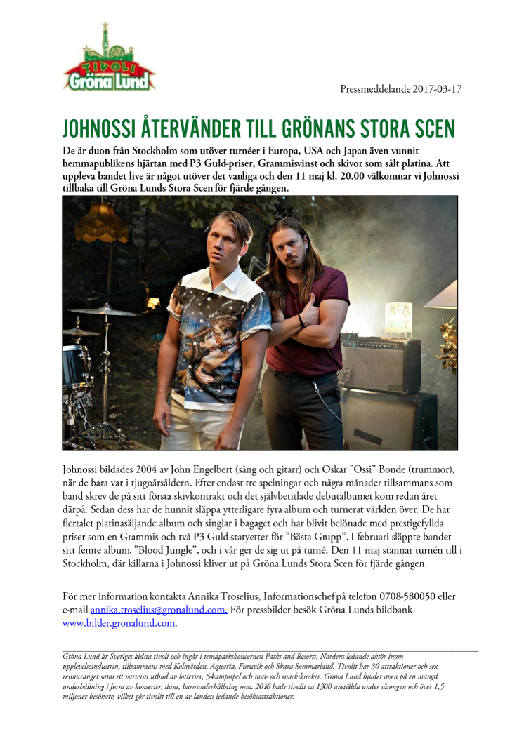 De är duon från Stockholm som utöver turnéer i Europa, USA och Japan även vunnit hemmapublikens hjärtan med P3 Guld-priser, Grammisvinster och skivor som sålt platina. Att uppleva bandet live är något utöver det vanliga och den 11 maj kl. 20.00 välkomnar vi Johnossi tillbaka till Gröna Lunds Stora Scen för fjärde gången.