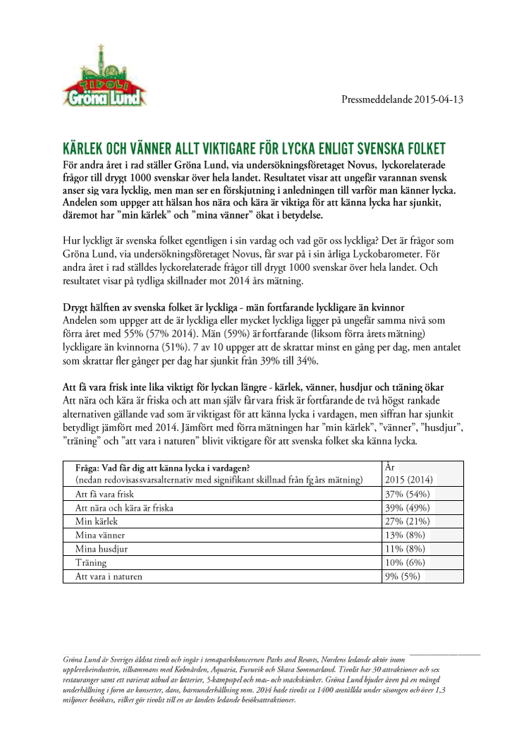 För andra året i rad ställer Gröna Lund lyckorelaterade frågor till drygt 1000 svenskar över hela landet. Resultatet visar att ungefär varannan svensk anser sig vara lycklig, men man ser en förskjutning i anledningen till varför man känner lycka. Andelen som uppger att hälsan hos nära och kära är viktiga för att känna lycka har sjunkit, däremot har ”min kärlek” och ”mina vänner” ökat i betydelse.