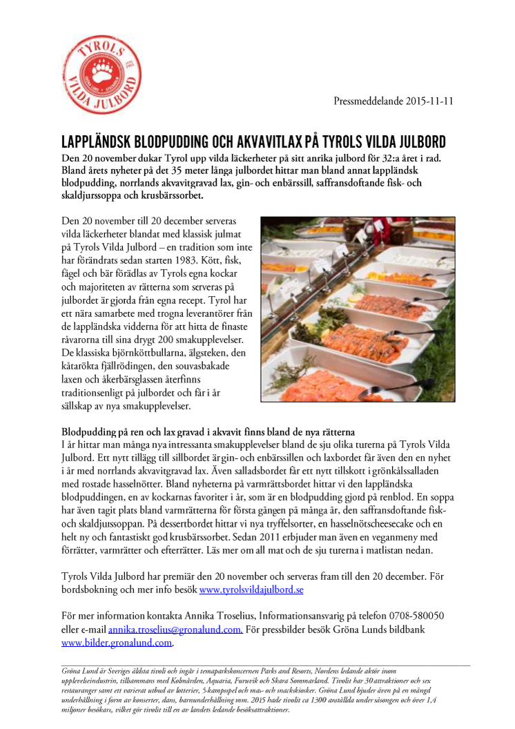 Den 20 november dukar Tyrol upp vilda läckerheter på sitt anrika julbord för 32:a året i rad. Bland årets nyheter på det 35 meter långa julbordet hittar man bland annat lappländsk blodpudding, norrlands akvavitgravad lax, gin- och enbärssill, saffransdoftande fisk- och skaldjurssoppa och krusbärssorbet.
