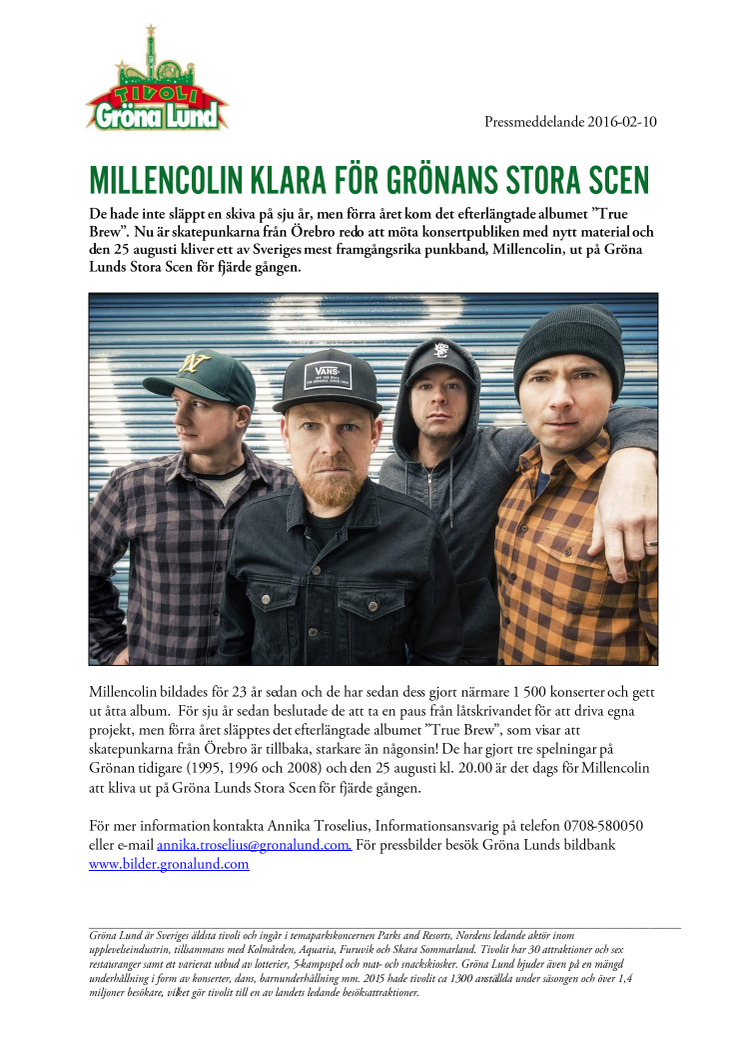 De hade inte släppt en skiva på sju år, men förra året kom det efterlängtade albumet ”True Brew”. Nu är skatepunkarna från Örebro redo att möta konsertpubliken med nytt material och den 25 augusti kliver ett av Sveriges mest framgångsrika punkband, Millencolin, ut på Gröna Lunds Stora Scen för fjärde gången.