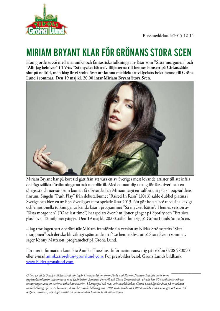 Hon gjorde succé med sina unika och fantastiska tolkningar av låtar som ”Sista morgonen” och ”Allt jag behöver” i TV4:s ”Så mycket bättre”. Biljetterna till hennes konsert på Cirkus sålde slut på nolltid, men idag är vi stolta över att kunna meddela att vi lyckats boka henne till Gröna Lund i sommar. Den 19 maj kl. 20.00 intar Miriam Bryant Stora Scen.