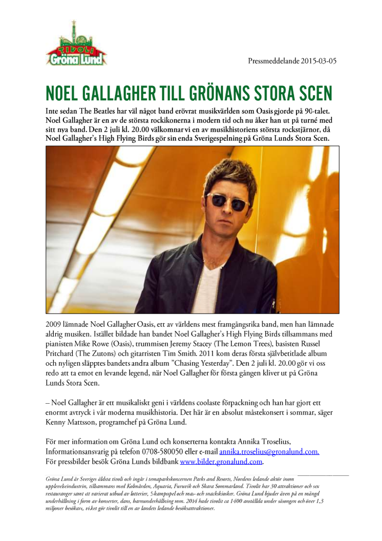 Inte sedan The Beatles har väl något band erövrat musikvärlden som Oasis gjorde på 90-talet. Noel Gallagher är en av de största rockikonerna i modern tid och nu åker han ut på turné med sitt nya band. Den 2 juli kl. 20.00 välkomnar vi en av musikhistoriens största rockstjärnor, då Noel Gallagher’s High Flying Birds gör sin enda Sverigespelning på Gröna Lunds Stora Scen.