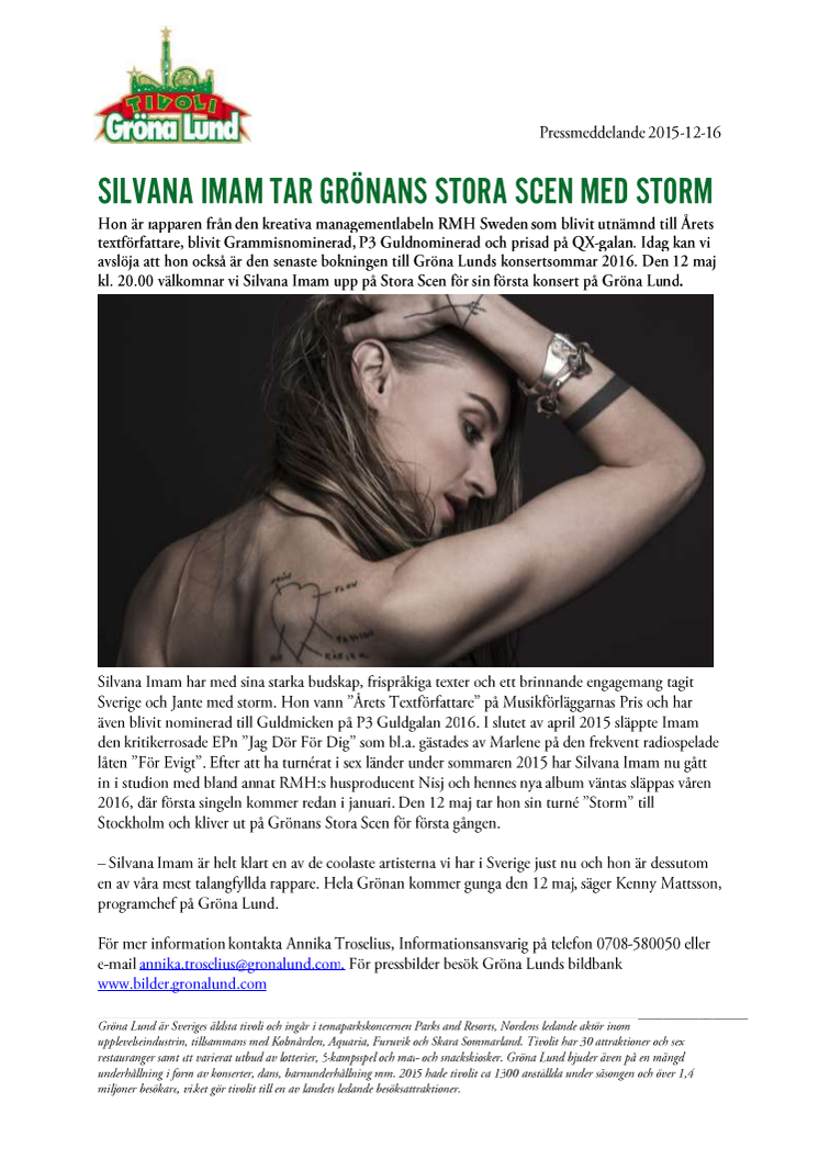 Hon är rapparen från den kreativa managementlabeln RMH Sweden som blivit utnämnd till Årets textförfattare, blivit Grammisnominerad, P3 Guldnominerad och prisad på QX-galan. Idag kan vi avslöja att hon också är den senaste bokningen till Gröna Lunds konsertsommar 2016. Den 12 maj kl. 20.00 välkomnar vi Silvana Imam upp på Stora Scen för sin första konsert på Gröna Lund.