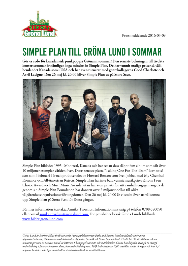 Gör er redo för kanadensisk punkpop på Grönan i sommar! Den senaste bokningen till tivolits konsertsommar är nämligen inga mindre än Simple Plan. De har vunnit otaliga priser så väl i hemlandet Kanada som i USA och har även turnerat med genrekollegorna Good Charlotte och Avril Lavigne. Den 26 maj kl. 20.00 kliver Simple Plan ut på Stora Scen.