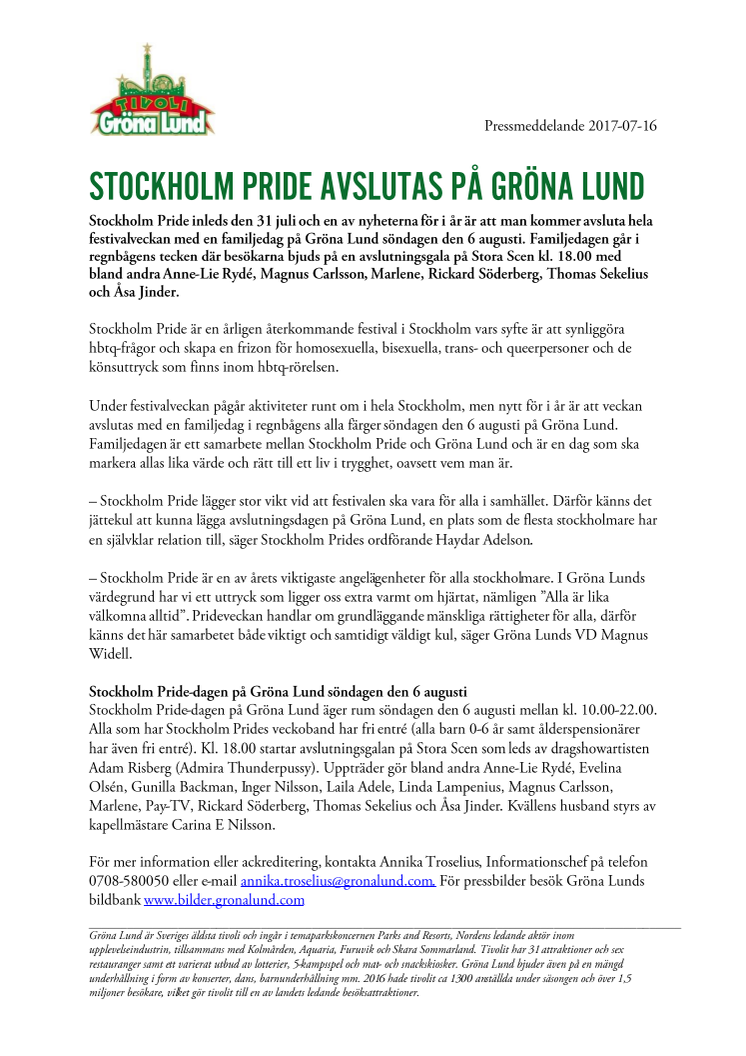 Stockholm Pride inleds den 31 juli och en av nyheterna för i år är att man kommer avsluta hela festivalveckan med en familjedag på Gröna Lund söndagen den 6 augusti. Familjedagen går i regnbågens tecken där besökarna bjuds på en avslutningsgala på Stora Scen kl. 18.00 med bland andra Anne-Lie Rydé, Magnus Carlsson, Marlene, Rickard Söderberg, Thomas Sekelius och Åsa Jinder.