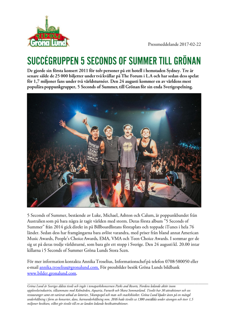 De gjorde sin första konsert 2011 för tolv personer på ett hotell i hemstaden Sydney. Tre år senare sålde de 25 000 biljetter under två kvällar på The Forum i L.A och har sedan dess spelat för 1,7 miljoner fans under två världsturnéer. Den 24 augusti kommer en av världens mest populära poppunkgrupper, 5 Seconds of Summer, till Grönan för sin enda Sverigespelning.