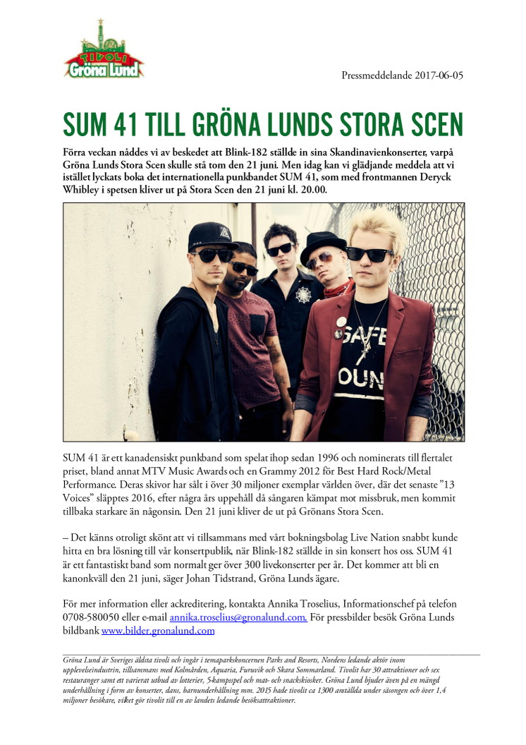 Förra veckan nåddes vi av beskedet att Blink-182 ställde in sina Skandinavienkonserter, varpå Gröna Lunds Stora Scen skulle stå tom den 21 juni. Men idag kan vi glädjande meddela att vi istället lyckats boka det internationella punkbandet SUM 41, som med frontmannen Deryck Whibley i spetsen kliver ut på Stora Scen den 21 juni kl. 20.00.