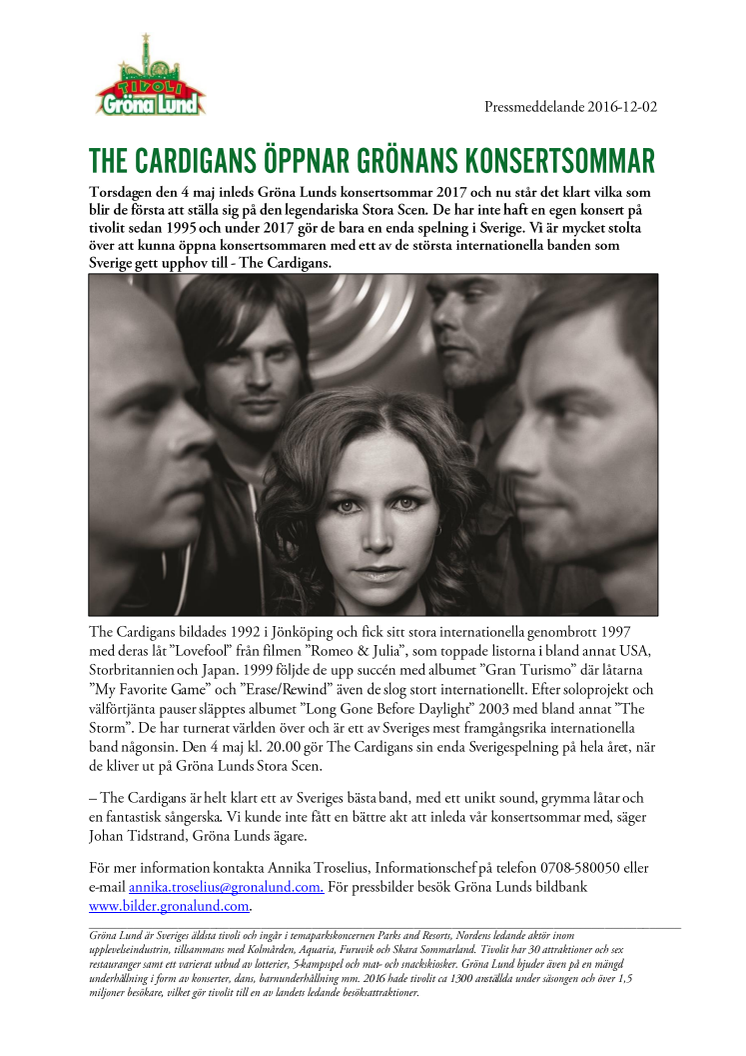 Torsdagen den 4 maj inleds Gröna Lunds konsertsommar 2017 och nu står det klart vilka som blir de första att ställa sig på Stora Scen. De har inte haft en egen konsert på tivolit sedan 1995 och under 2017 gör de bara en enda spelning i Sverige. Vi är mycket stolta över att kunna öppna konsertsommaren med ett av de största internationella banden som Sverige gett upphov till - The Cardigans.