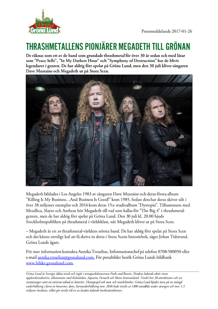 De räknas som ett av de band som grundade thrashmetal för över 30 år sedan och med låtar som ”Peace Sells”, ”In My Darkest Hour” och ”Symphony of Destruction” har de blivit legendarer i genren. De har aldrig förr spelat på Gröna Lund, men den 30 juli kliver sångaren Dave Mustaine och Megadeth ut på Stora Scen.