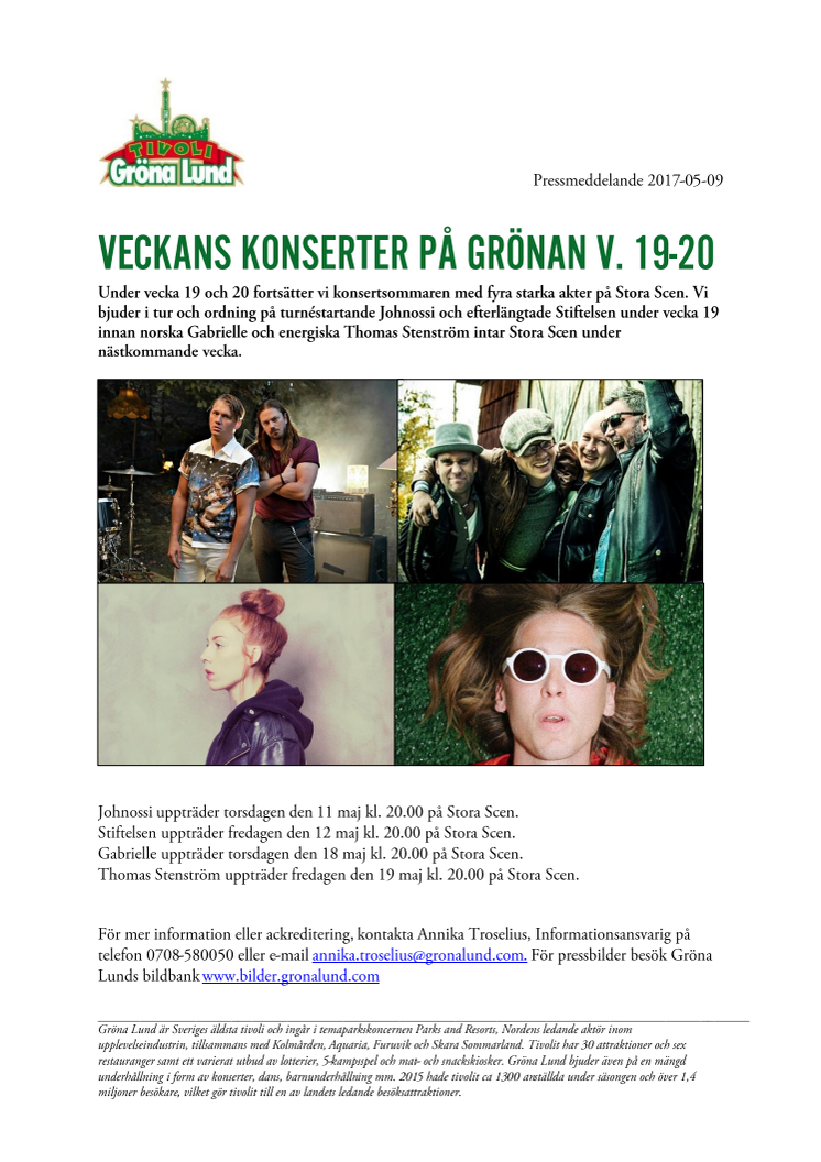 Under vecka 19 och 20 fortsätter vi konsertsommaren med fyra starka akter på Stora Scen. Vi bjuder i tur och ordning på turnéstartande Johnossi och efterlängtade Stiftelsen under vecka 19 innan norska Gabrielle och energiska Thomas Stenström intar Stora Scen under nästkommande vecka.