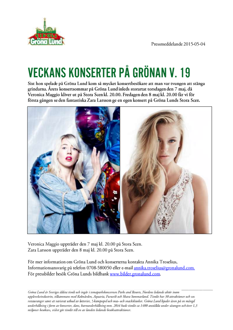 Sist hon spelade på Gröna Lund kom så mycket konsertbesökare att man var tvungen att stänga grindarna. Årets konsertsommar på Gröna Lund inleds storartat torsdagen den 7 maj, då Veronica Maggio kliver ut på Stora Scen kl. 20.00. Fredagen den 8 maj kl. 20.00 får vi för första gången se den fantastiska Zara Larsson ge en egen konsert på Gröna Lunds Stora Scen.