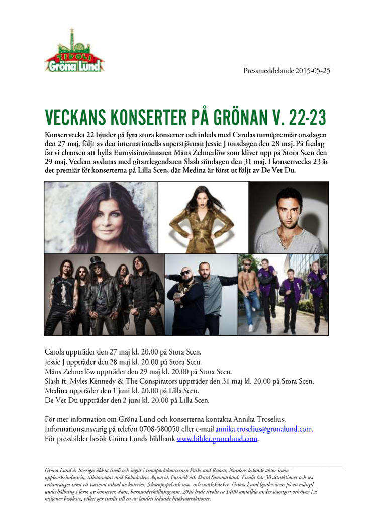Konsertvecka 22 inleds med Carolas turnépremiär onsdagen den 27 maj, följt av den internationella superstjärnan Jessie J torsdagen den 28 maj. På fredag hyllar vi Eurovisionvinnaren Måns Zelmerlöw på Stora Scen den 29 maj. Veckan avslutas med gitarrlegendaren Slash söndagen den 31 maj. I konsertvecka 23 är det premiär för konserterna på Lilla Scen, där Medina är först ut följt av De Vet Du.