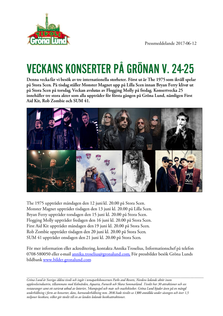 Denna vecka är The 1975 först ut, som ikväll spelar på Stora Scen. På tisdag ställer Monster Magnet upp på Lilla Scen innan Bryan Ferry kliver ut på Stora Scen på torsdag. Veckan avslutas av Flogging Molly på fredag. Konsertvecka 25 innehåller tre stora akter som alla uppträder för första gången på Gröna Lund, nämligen First Aid Kit, Rob Zombie och SUM 41.