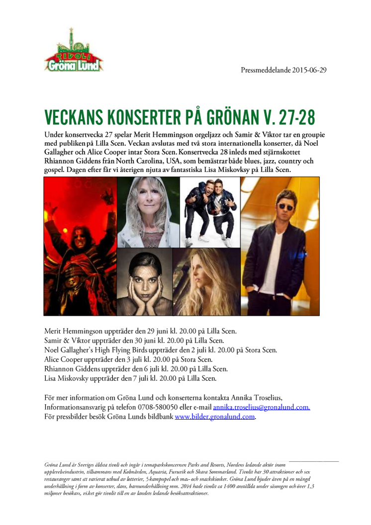 I konsertvecka 27 spelar Merit Hemmingson orgeljazz och Samir & Viktor tar en groupie på Lilla Scen. Veckan avslutas med två internationella konserter, då Noel Gallagher och Alice Cooper intar Stora Scen. Konsertvecka 28 inleds med stjärnskottet Rhiannon Giddens från North Carolina, som bemästrar blues, jazz, country och gospel. Dagen efter får vi återigen njuta av Lisa Miskovksy på Lilla Scen.