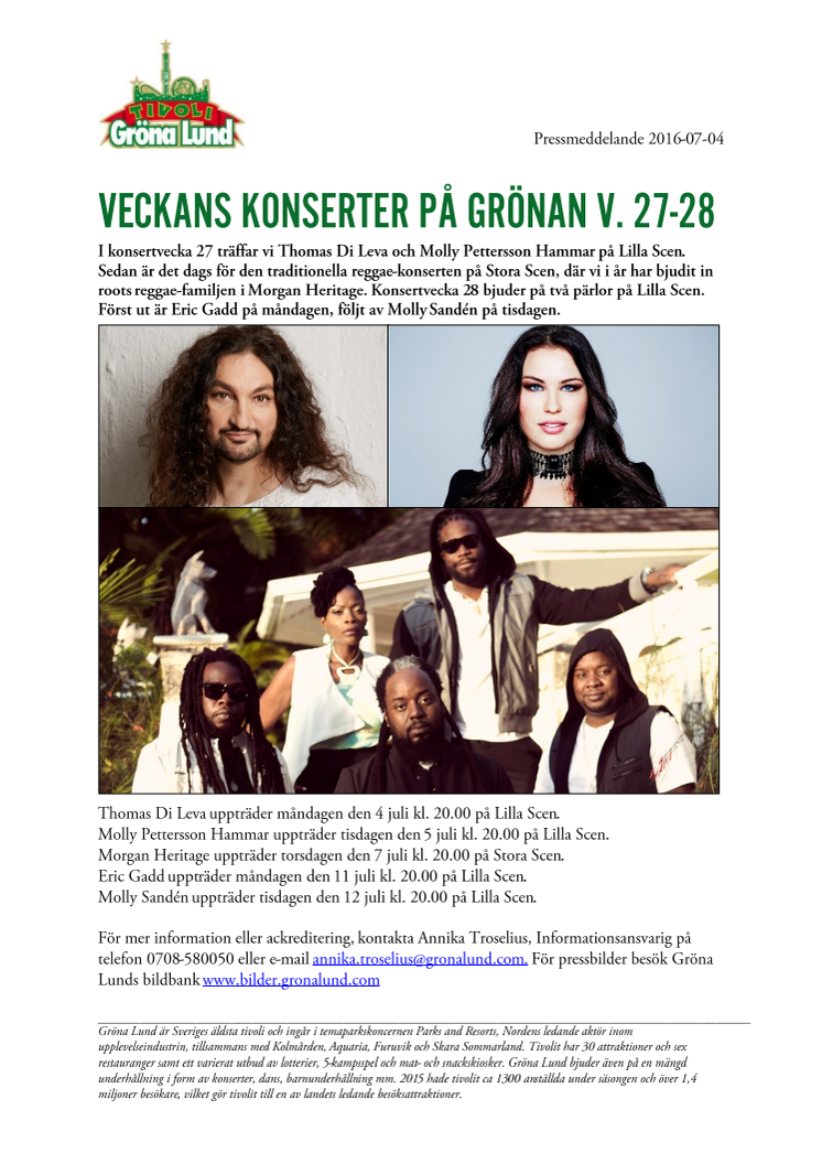 I konsertvecka 27 träffar vi Thomas Di Leva och Molly Pettersson Hammar på Lilla Scen. Sedan är det dags för den traditionella reggae-konserten på Stora Scen, där vi i år har bjudit in roots reggae-familjen i Morgan Heritage. Konsertvecka 28 bjuder på två pärlor på Lilla Scen. Först ut är Eric Gadd på måndagen, följt av Molly Sandén på tisdagen.