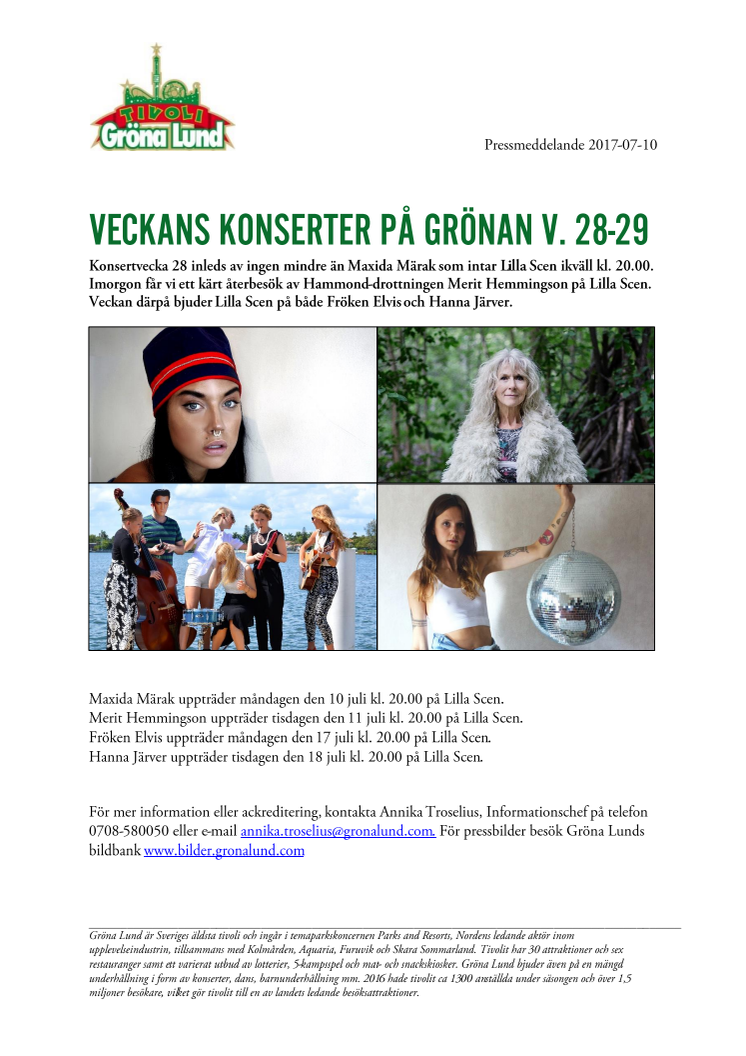 Konsertvecka 28 inleds av ingen mindre än Maxida Märak som intar Lilla Scen ikväll kl. 20.00. Imorgon får vi ett kärt återbesök av Hammond-drottningen Merit Hemmingson på Lilla Scen. Veckan därpå bjuder Lilla Scen på både Fröken Elvis och Hanna Järver.