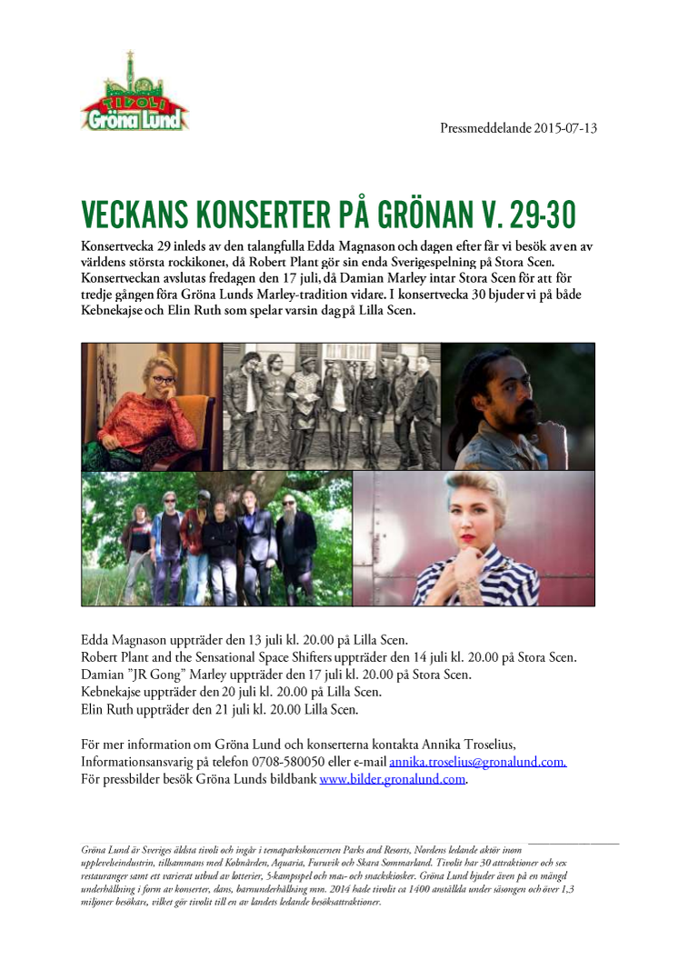 Konsertvecka 29 inleds av Edda Magnason och dagen efter får vi besök av en av världens största rockikoner, då Robert Plant gör sin enda Sverigespelning på Stora Scen. Konsertveckan avslutas den 17 juli, då Damian Marley intar Stora Scen för att för tredje gången föra Gröna Lunds Marley-tradition vidare. I konsertvecka 30 bjuder vi på Kebnekajse och Elin Ruth som spelar varsin dag på Lilla Scen.