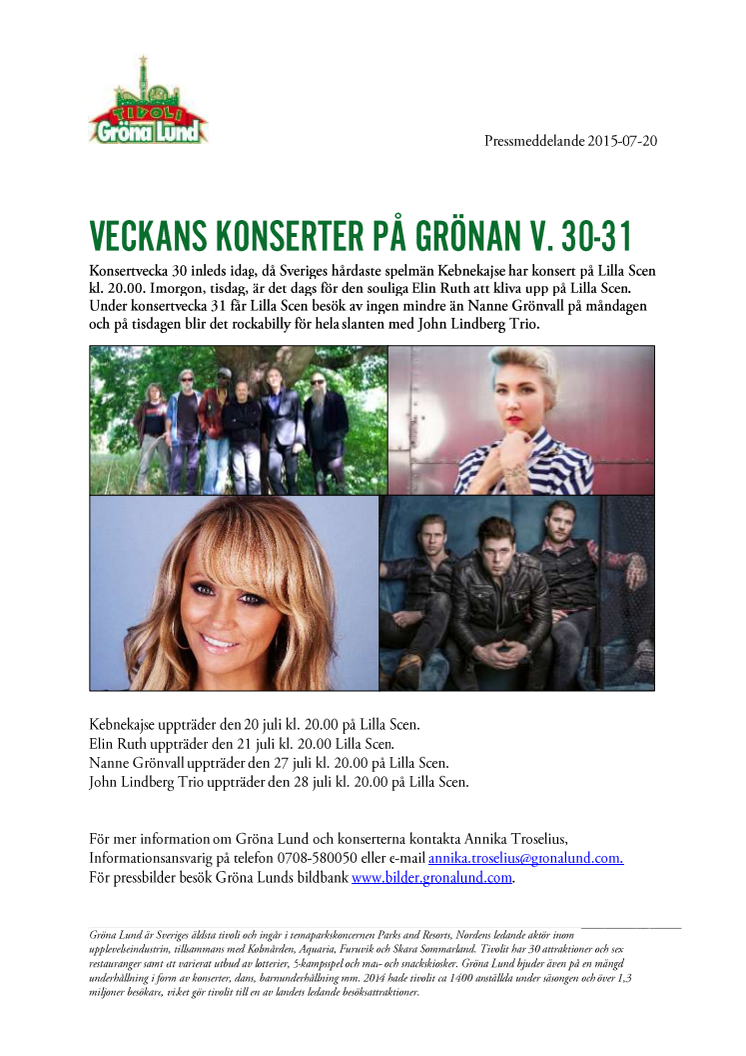 Konsertvecka 30 inleds idag, då Sveriges hårdaste spelmän Kebnekajse har konsert på Lilla Scen kl. 20.00. Imorgon, tisdag, är det dags för den souliga Elin Ruth att kliva upp på Lilla Scen. Under konsertvecka 31 får Lilla Scen besök av ingen mindre än Nanne Grönvall på måndagen och på tisdagen blir det rockabilly för hela slanten med John Lindberg Trio.
