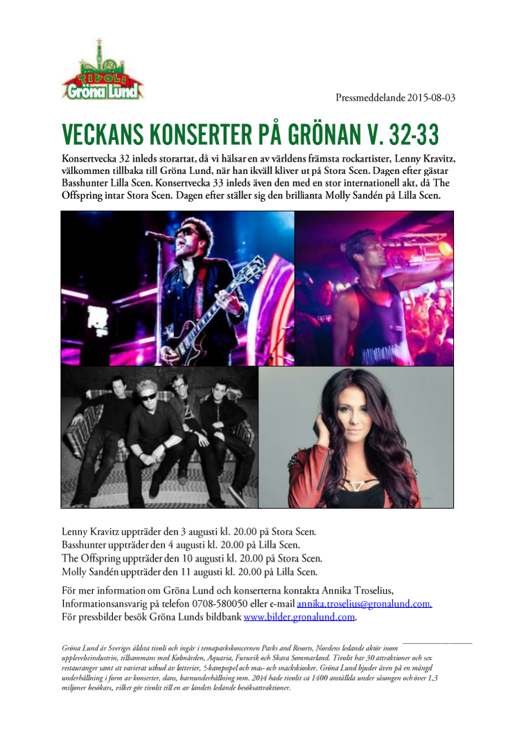 Konsertvecka 32 inleds storartat, då vi hälsar en av världens främsta rockartister, Lenny Kravitz, välkommen tillbaka till Gröna Lund, när han ikväll kliver ut på Stora Scen. Dagen efter gästar Basshunter Lilla Scen. Konsertvecka 33 inleds även den med en stor internationell akt, då The Offspring intar Stora Scen. Dagen efter ställer sig den brillianta Molly Sandén på Lilla Scen.