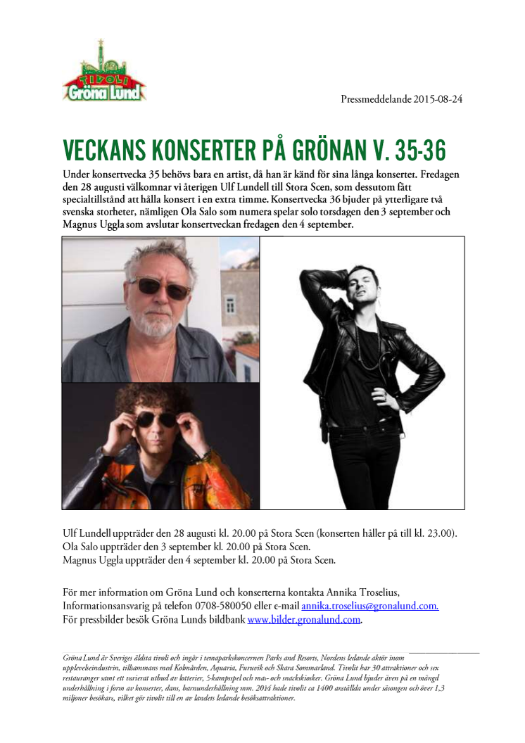 Fredagen den 28 augusti välkomnar vi återigen Ulf Lundell till Stora Scen, som dessutom fått specialtillstånd att hålla konsert i en extra timme. Konsertvecka 36 bjuder på ytterligare två svenska storheter, nämligen Ola Salo som numera spelar solo torsdagen den 3 september och Magnus Uggla som avslutar konsertveckan fredagen den 4 september.