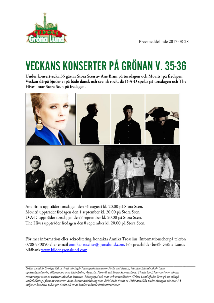Under konsertvecka 35 gästas Stora Scen av Ane Brun på torsdagen och Movits! på fredagen. Veckan därpå bjuder vi på både dansk och svensk rock, då D-A-D spelar på torsdagen och The Hives intar Stora Scen på fredagen.
