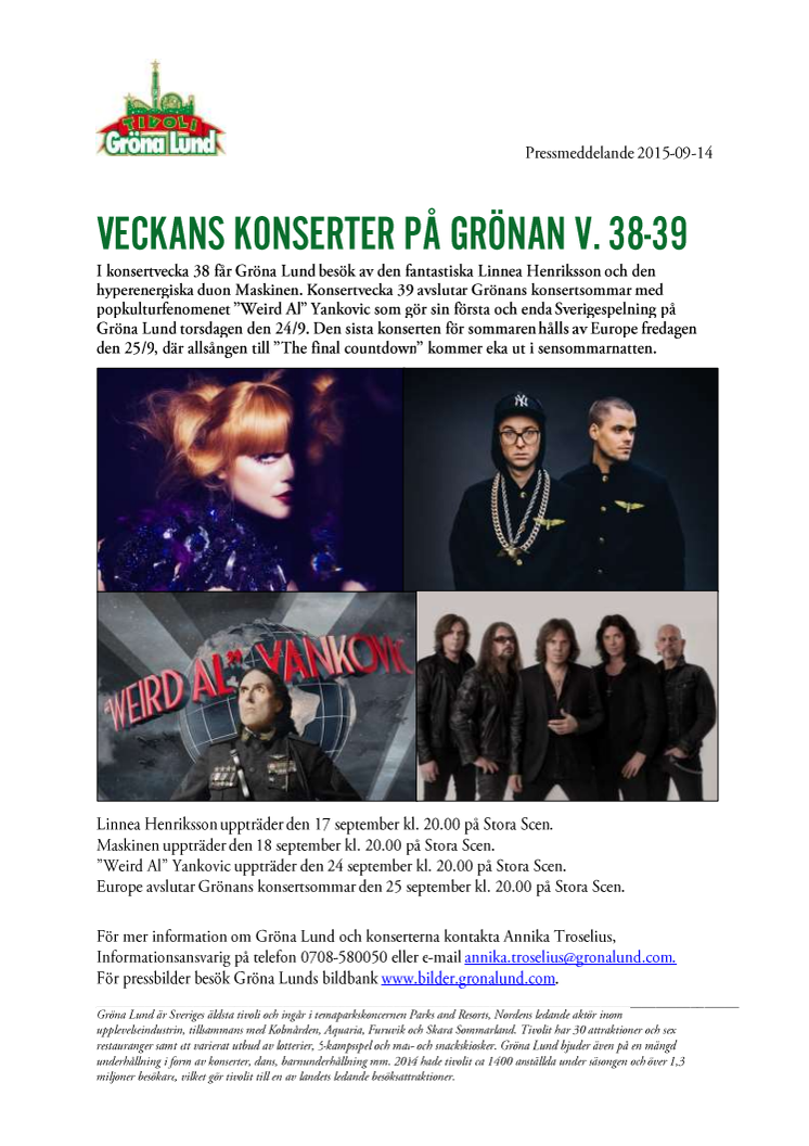 I konsertvecka 38 får Gröna Lund besök av den fantastiska Linnea Henriksson och den hyperenergiska duon Maskinen. I konsertvecka 39 gör popkulturfenomenet ”Weird Al” Yankovic sin första och enda Sverigespelning på Gröna Lund torsdagen den 24/9. Den sista konserten för sommaren hålls av Europe fredagen den 25/9, där allsången till ”The final countdown” kommer eka ut i sensommarnatten.