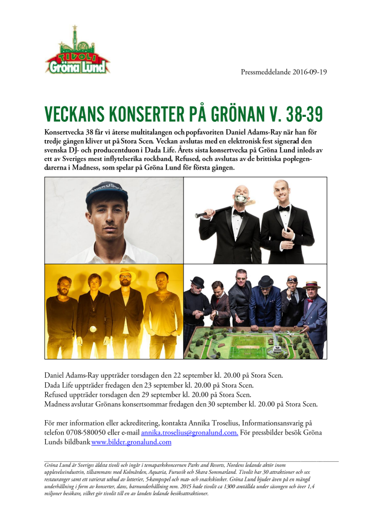 Konsertvecka 38 får vi återse Daniel Adams-Ray när han för tredje gången kliver ut på Stora Scen. Veckan avslutas med en elektronisk fest signerad den svenska DJ- och producentduon i Dada Life. Årets sista konsertvecka på Gröna Lund inleds av ett av Sveriges mest inflytelserika rockband, Refused, och avslutas av de brittiska poplegendarerna i Madness, som spelar på Gröna Lund för första gången.