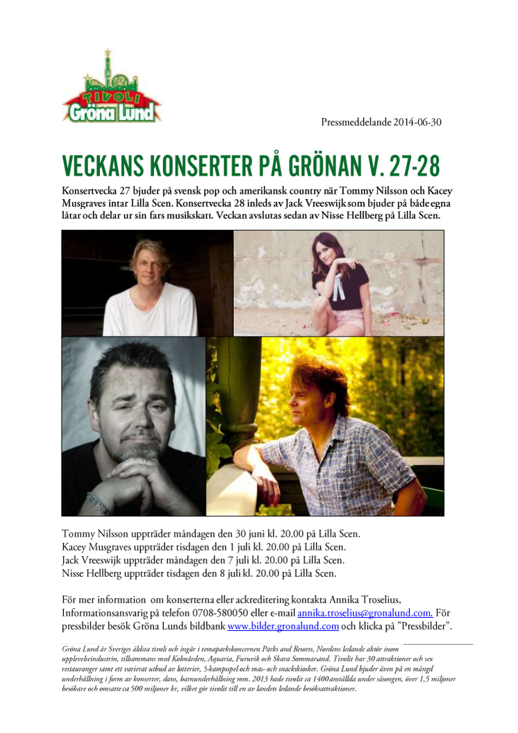 Konsertvecka 27 bjuder på svensk pop och amerikansk country när Tommy Nilsson och Kacey Musgraves intar Lilla Scen. Konsertvecka 28 inleds av Jack Vreeswijk som bjuder på både egna låtar och delar ur sin fars musikskatt. Veckan avslutas sedan av Nisse Hellberg på Lilla Scen.