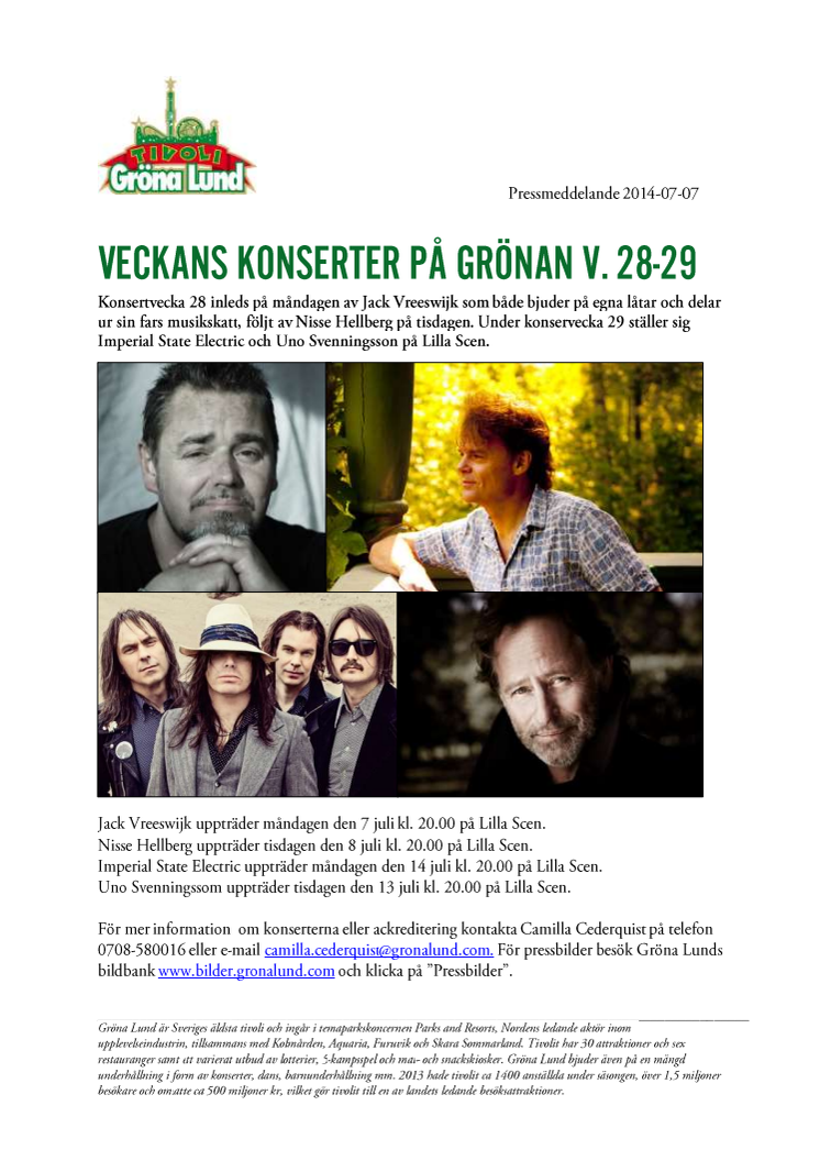Konsertvecka 28 inleds på måndagen av Jack Vreeswijk som både bjuder på egna låtar och delar ur sin fars musikskatt, följt av Nisse Hellberg på tisdagen. Under konservecka 29 ställer sig Imperial State Electric och Uno Svenningsson på Lilla Scen.