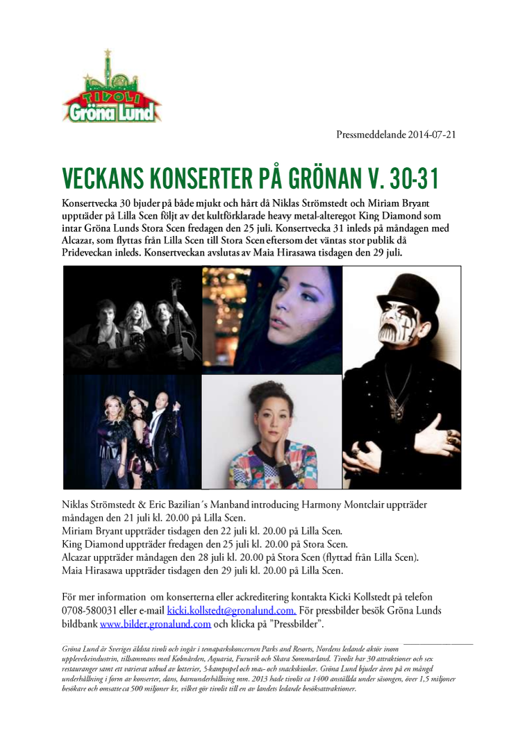 Konsertvecka 30 bjuder på Niklas Strömstedt och Miriam Bryant som uppträder på Lilla Scen följt av det kultförklarade heavy metal-alteregot King Diamond som intar Stora Scen den 25 juli. Konsertvecka 31 inleds på måndagen med Alcazar, som flyttas från Lilla Scen till Stora Scen eftersom det väntas stor publik då Prideveckan inleds. Konsertveckan avslutas av Maia Hirasawa tisdagen den 29 juli.