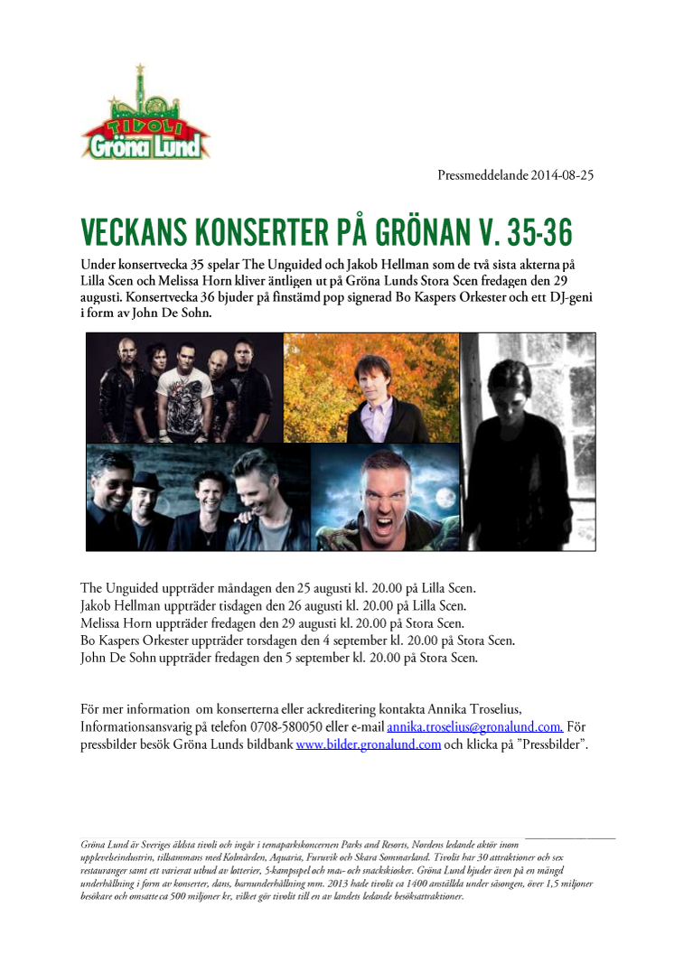 Under konsertvecka 35 spelar The Unguided och Jakob Hellman som de två sista akterna på Lilla Scen och Melissa Horn kliver äntligen ut på Gröna Lunds Stora Scen fredagen den 29 augusti. Konsertvecka 36 bjuder på finstämd pop signerad Bo Kaspers Orkester och ett DJ-geni i form av John De Sohn.