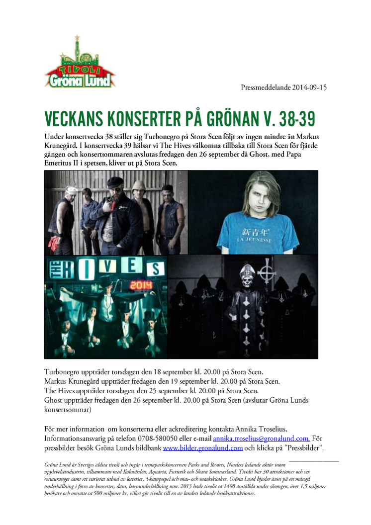 Under konsertvecka 38 ställer sig Turbonegro på Stora Scen följt av ingen mindre än Markus Krunegård. I konsertvecka 39 hälsar vi The Hives välkomna tillbaka till Stora Scen för fjärde gången och konsertsommaren avslutas fredagen den 26 september då Ghost, med Papa Emeritus II i spetsen, kliver ut på Stora Scen.