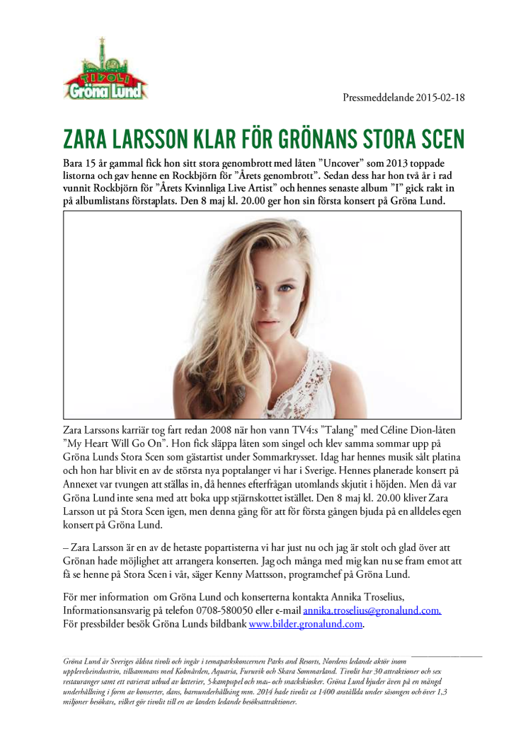 Bara 15 år gammal fick hon sitt stora genombrott med låten ”Uncover” som 2013 toppade listorna och gav henne en Rockbjörn för ”Årets genombrott”. Sedan dess har hon två år i rad vunnit Rockbjörn för ”Årets Kvinnliga Live Artist” och hennes senaste album ”I” gick rakt in på albumlistans förstaplats. Den 8 maj kl. 20.00 ger hon sin första konsert på Gröna Lund.