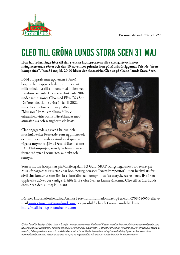 Som artist har hon prisats på Manifestgalan, P3 Guld, SKAP, Kingsizegalan och nu senast på Musikförläggarnas Pris 2023 där hon mottog pris som ”Årets kompositör”. Hon har hyllats för såväl sina konserter som för sitt auktoritära och kompromisslösa uttryck. Att se henne live är en upplevelse utöver det vanliga. Därför är vi stolta över att kunna välkomna Cleo till Gröna Lunds Stora Scen den 31 maj kl. 20.00.