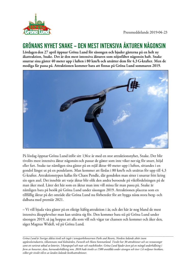 På lördag öppnar Gröna Lund inför sitt 136:e år med en stor attraktionsnyhet, Snake. Det blir tivolits mest intensiva åktur någonsin och passar de gäster som inte viker ner sig för snurr, höjd eller fart. Snake tar nämligen sina gäster på en rejäl åktur 40 meter upp i luften, sittandes i en gondol längst ut på en pendelarm. Man kommer att färdas i 80 km/h och utsättas för upp till 4,3 G-krafter. Attraktionstypen kallas för Chaos Pendle, där gondolen man sitter i snurrar fritt kring sin egen axel. Det innebär att varje åktur blir olik den andra beroende på viktfördelningen på de man åker med. Låter det här som en åktur man inte vill missa får man passa på. Snake är nämligen bara på besök på Gröna Lund under säsongen 2019. Attraktionen placeras som en tillfällig åktur på det område där Gröna Lund nu förbereder för att bygga nästa stora berg- och dalbana med premiär 2021.