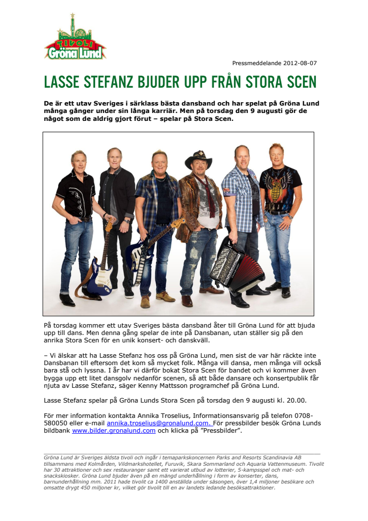 – Vi älskar att ha Lasse Stefanz hos oss på Gröna Lund, men sist de var här räckte inte Dansbanan till eftersom det kom så mycket folk. Många vill dansa, men många vill också bara stå och lyssna. I år har vi därför bokat Stora Scen för bandet och vi kommer även bygga upp ett litet dansgolv nedanför scenen, så att både dansare och konsertpublik får njuta av Lasse Stefanz, säger Kenny Mattsson programchef på Gröna Lund.