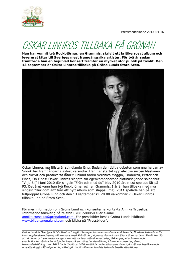 För mer information om Gröna Lund och konserterna kontakta Annika Troselius, Informationsansvarig på telefon 0708-580050 eller e-mail annika.troselius@gronalund.com. För pressbilder besök Gröna Lunds bildbank www.bilder.gronalund.com och klicka på ”Pressbilder”.