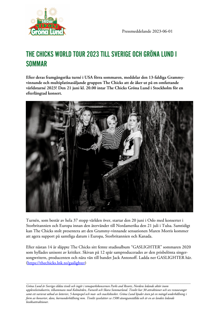 Efter deras framgångsrika turné i USA förra sommaren, meddelar den 13-faldiga Grammy-vinnande och multiplatinasäljande gruppen The Chicks att de åker ut på en omfattande världsturné 2023! Den 21 juni kl. 20.00 intar The Chicks Gröna Lund i Stockholm för en efterlängtad konsert.
